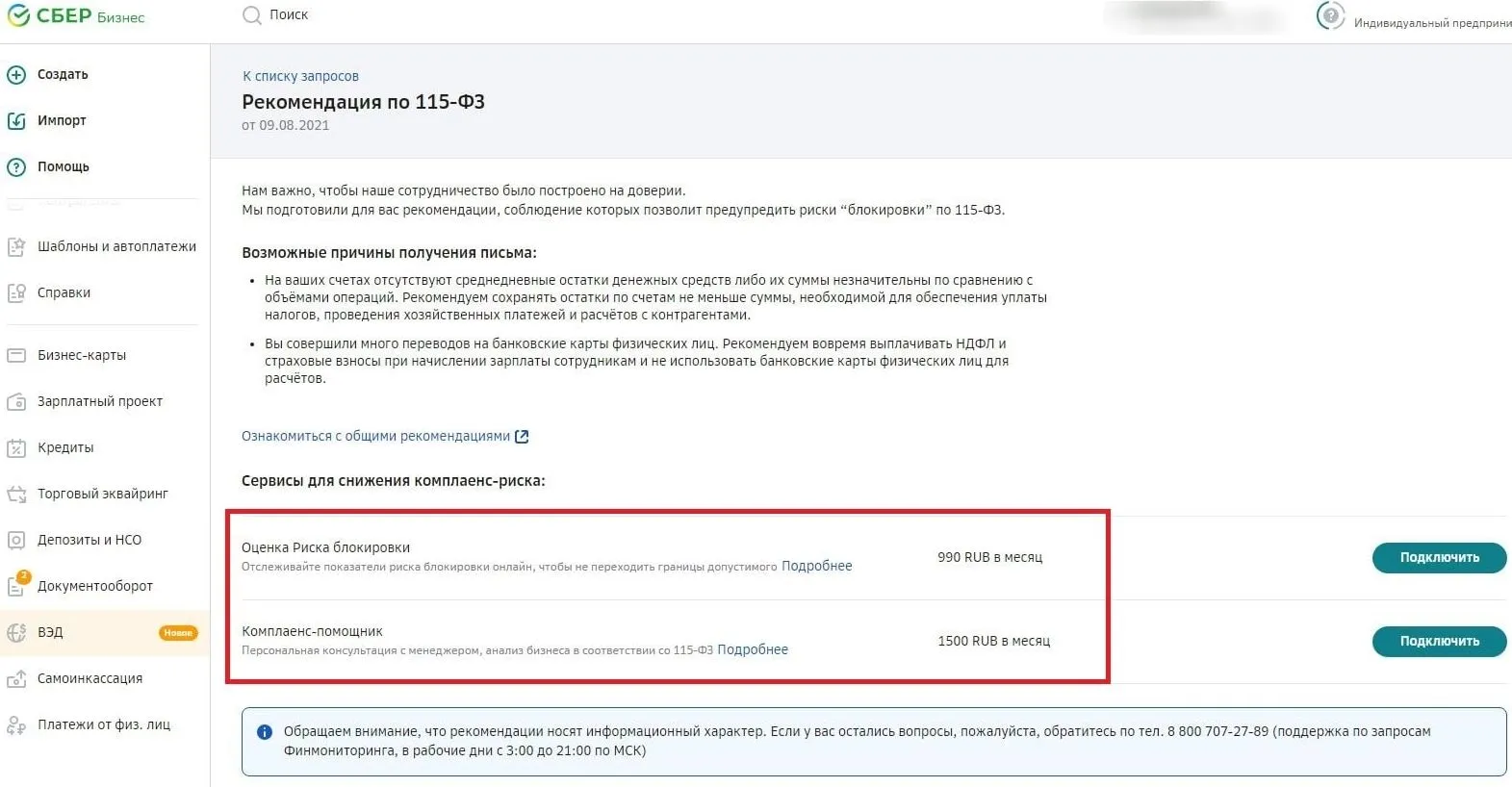 ИП из Сбера прилетела рекомендация по оценке рисков блокировки по 115-ФЗ. За деньги, разумеется