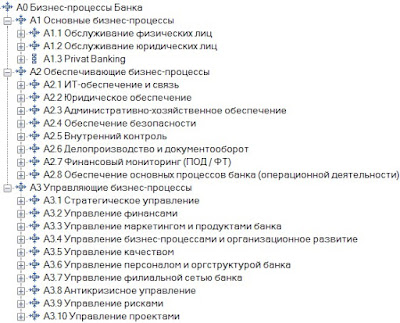 Рис. 2. Дерево (реестр) бизнес-процессов банка (верхний уровень)
