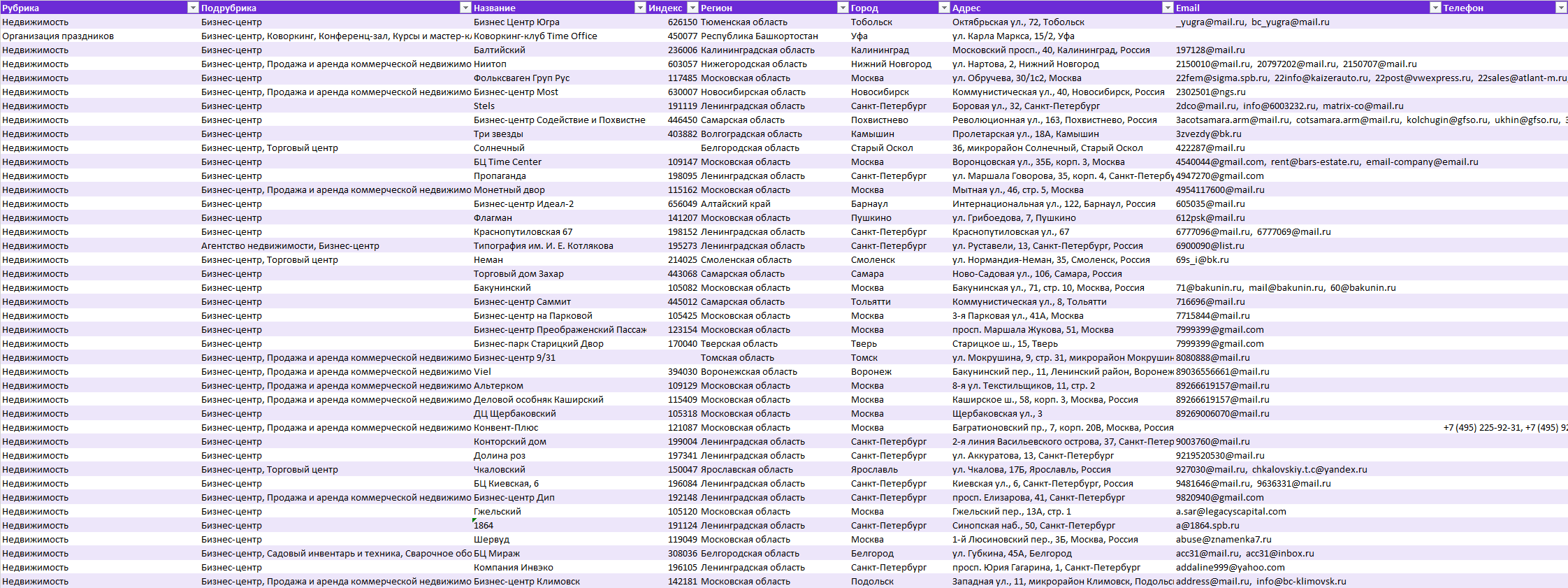 База бизнес центр список организаций представлен в формате Excel файла и содержит информацию о наименовании компании, видах деятельности, стране, регионе, городе, полном адресе, мобильных и городских телефонах, e-mail и сайтах, графике работы и ссылках на социальные сети (ВКонтакте, Одноклассники, Facebook, Instagram, YouTube, Twitter). Кроме того, есть возможность с помощью фильтра выбрать или исключить компании, имеющие несколько филиалов / подразделений.