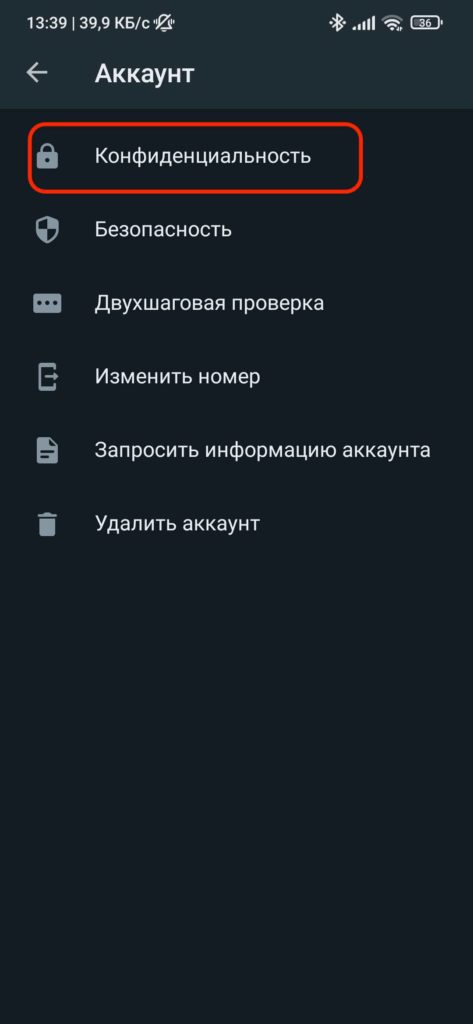 В разделе «Аккаунт» выберите «Конфиденциальность».
