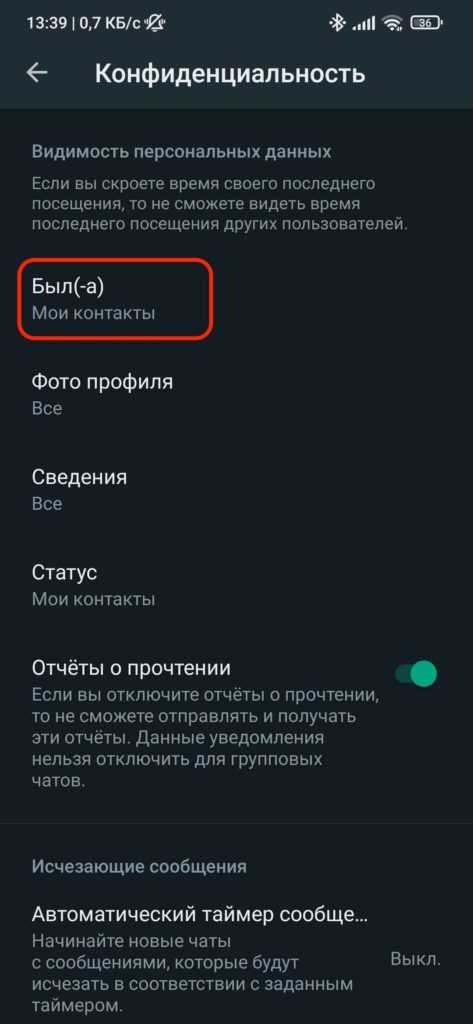 В верхней части раздела «Конфиденциальность» вы увидите возможность изменить настройки статуса «Видимость персональных данных». Нажмите «Был(а)» и выберите «Все», «Мои контакты» или «Никто».