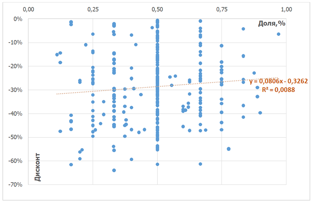Средние значения дисконтов для наиболее распространённых размеров долей очень близки, находятся в диапазоне 26–29,2%.