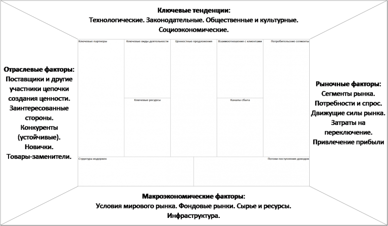 Бизнес работает в живой среде рынка, поэтому необходимо отслеживать внешние факторы, влияющие на него, чтобы вовремя адаптировать его к новым условиям. Среда является «пространством дизайна» вашей модели — она дает определенные возможности и ограничения, с которыми вы можете работать. Оцените устойчивость блоков вашей модели в зависимости от среды бизнеса. На бизнес влияют рыночные, отраслевые, макроэкономические факторы и ключевые тенденции.