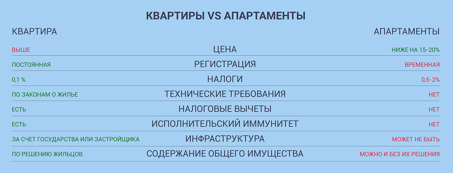 Апартаменты признаются нежилыми помещениями, предназначенными лишь для временного проживания граждан. Для таких проектов действует упрощенный порядок согласования, у застройщиков нет жестких обязательств по возведению сопутствующей инфраструктуры, строительные нормы (по инсоляции, планировкам и т. д.) менее строги, чем для жилья.