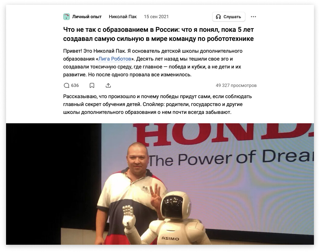 В статье «Что не так с образованием в России: что я понял, пока 5 лет создавал самую сильную в мире команду по робототехнике» мы используем этот прием по полной. Сначала у нас все настолько хорошо, что уже на втором экране приходит успешный успех. Потом успех мгновенно оборачивается провалом. Мы попадаем в яму депрессии и самобичевания.