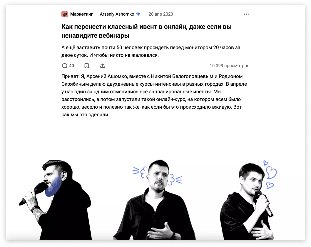 Мы написали для себя и клиентов больше 50 статей на vc.ru — и многие из них собирали десятки тысяч просмотров и приводили компании-заказчику много лидов. А одна из наших статей вошла в десятку самых популярных публикаций на vc.ru за все время.
