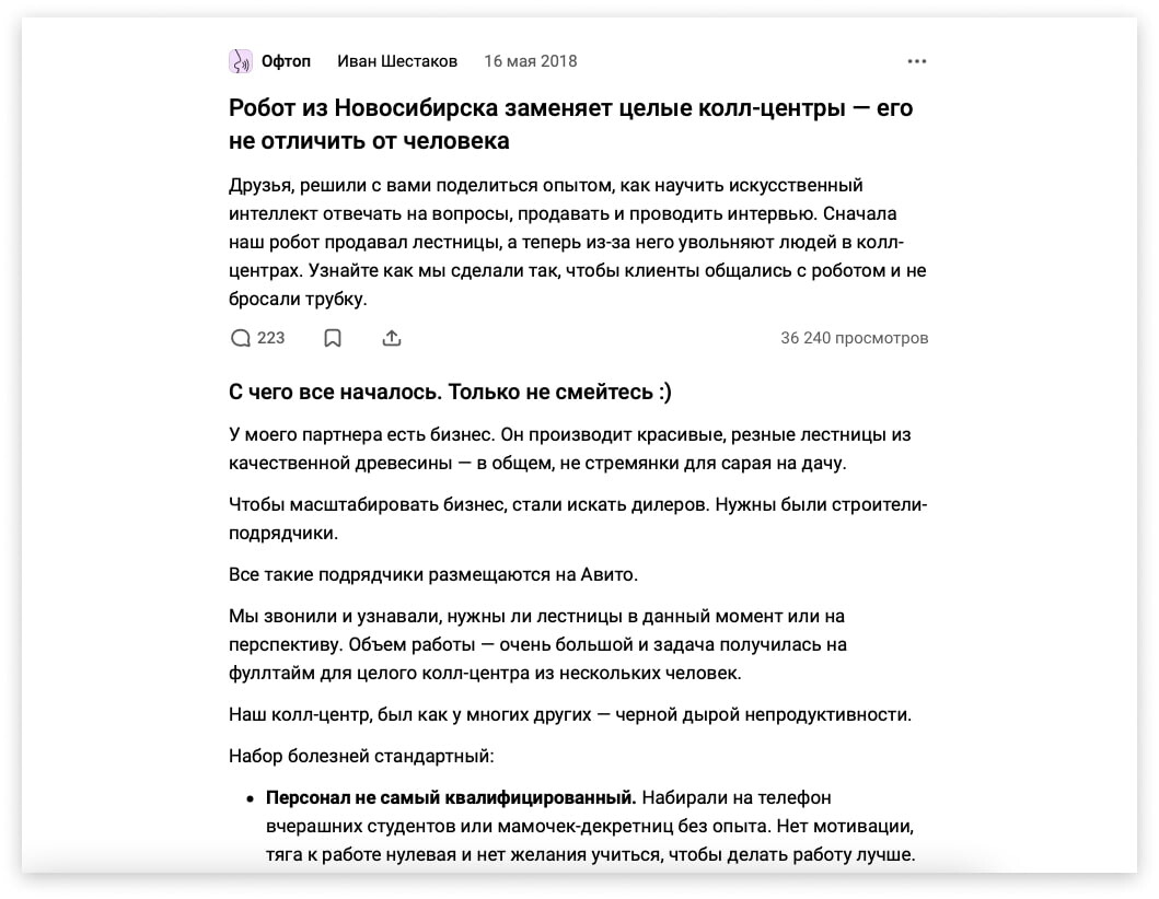 Например, статья «Робот из Новосибирска заменяет целые колл-центры — его не отличить от человека» начинается с того, как сложно было автору нанять нормальных специалистов в колл-центр. Так мы доходим до робота, который появился как решение этой проблемы. Далее — рассказ о том, как робот развивался и постепенно становится все лучше и лучше. В итоге, получилась история со своим сюжетом, которую интересно читать.
