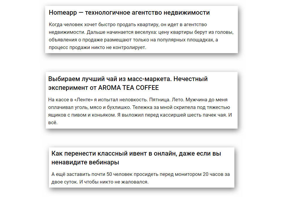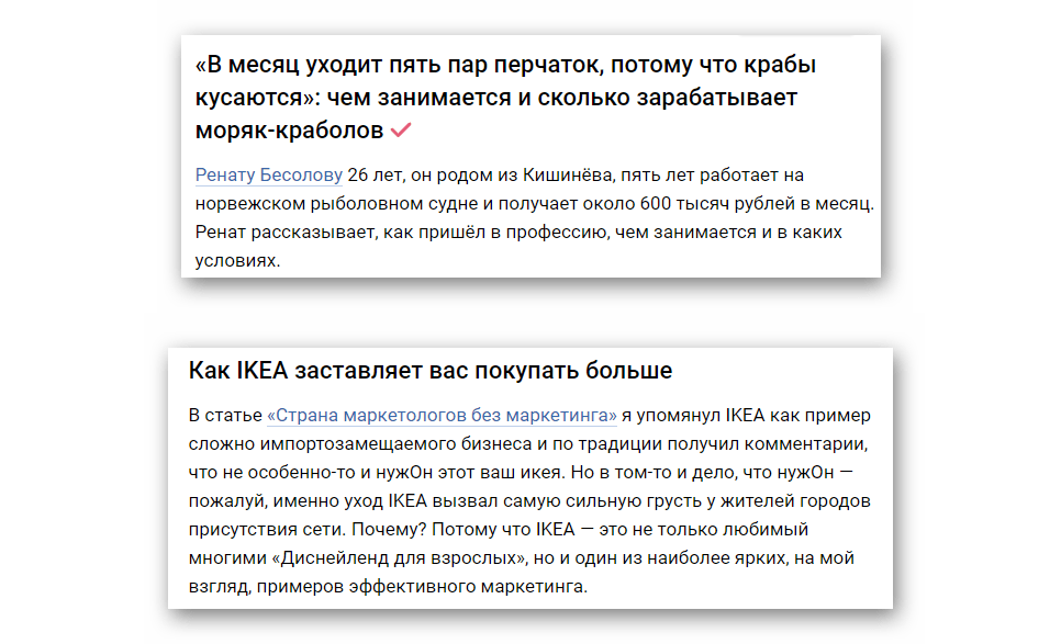 Хороший экспертный материал может не собрать охваты только из-за того, что статья в ленте выглядит скучной и вторичной. Поэтому нужно очень тщательно проработать название и вступление.