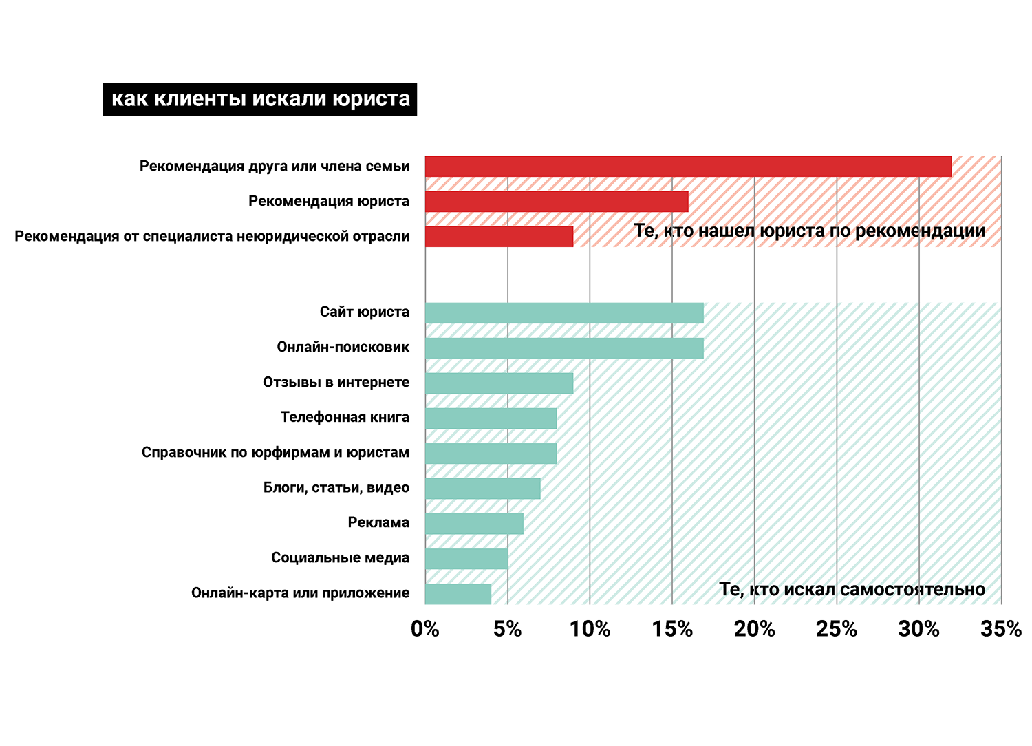 59% из клиентов юристов при выборе специалиста или компании опираются на рекомендацию. Чаще всего это рекомендация друзей и членов семьи (32%), за ними следуют рекомендации от адвоката (16%) или другого специалиста, не являющегося юристом (9%). Неюристом может быть бухгалтер, агент по недвижимости и другие специалисты.