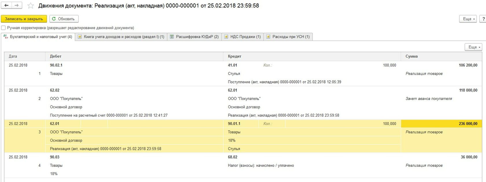 236 000,00 в т.ч НДС 18% (36 000,00). Поэтому покупателю был выставлен счет на оплату и он оплатил 50% от счета. И здесь начинается самое интересное: Посмотрим проводки этой операции:
