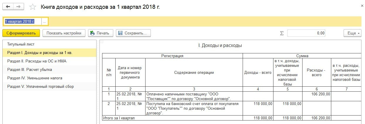Теперь, когда мы отгрузили товар с НДС, программа понимает, что оплата по этой отгрузке была с НДС, а значит НДС с предоплаты в сумме 18 000,00 теперь должен признаться не налоговым доходом, налоговой задолженностью. Поэтому должен быть сторнирован в КУДиР, в чем мы сейчас удостоверимся: