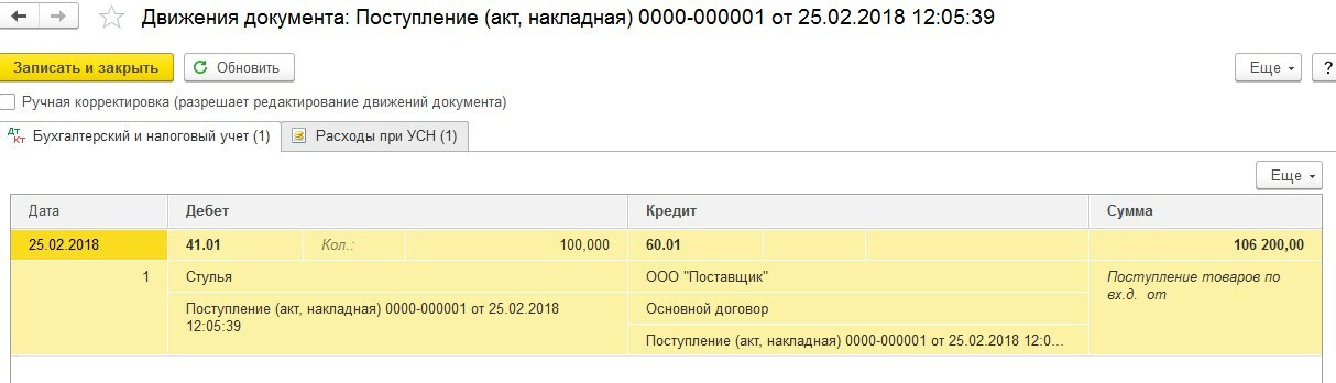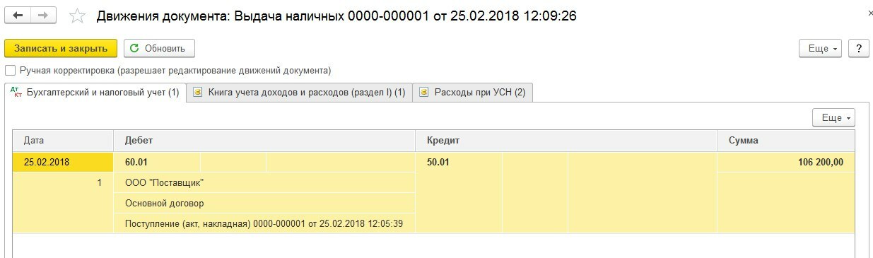 Как известно при УСН используется Кассовый метод учета затрат, поэтому оплатив товар, удостоверимся, что наша сумма 106 200.00 принялась к расходу. Напомню, что к налоговому расходу мы можем принять только тот товар/услуги, которые оплачены и оприходованы. В случае с товарами — в момент их отгрузки, в случае с услугами — в момент принятия к расходам.