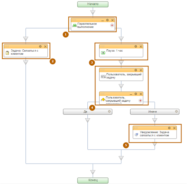 Суть в том, что параллельно (1) должны быть поставлены задача с крайним сроком 1 час (2) и пауза (3) на точно такой же срок. После паузы ставится проверка (4), завершена ли задача. И, если задача не завершена, то руководителю отправляется уведомление (5).