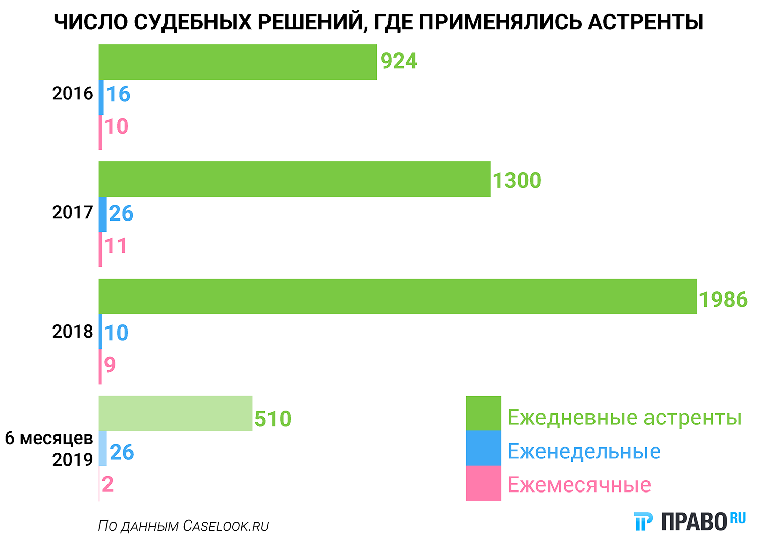 По сведениям Casebook, в арбитражной системе налагается порядка 1000–2000 астрентов в год. Наиболее популярны судебные неустойки, которые начисляются ежедневно. Они лидируют со значительным отрывом от еженедельных и ежемесячных. «Астрент эффективен, когда он назначается за каждый день неисполнения обязательств», – комментирует партнёр КА Минеев и партнеры Минеев и партнеры Федеральный рейтинг. × Анна Киндеева.