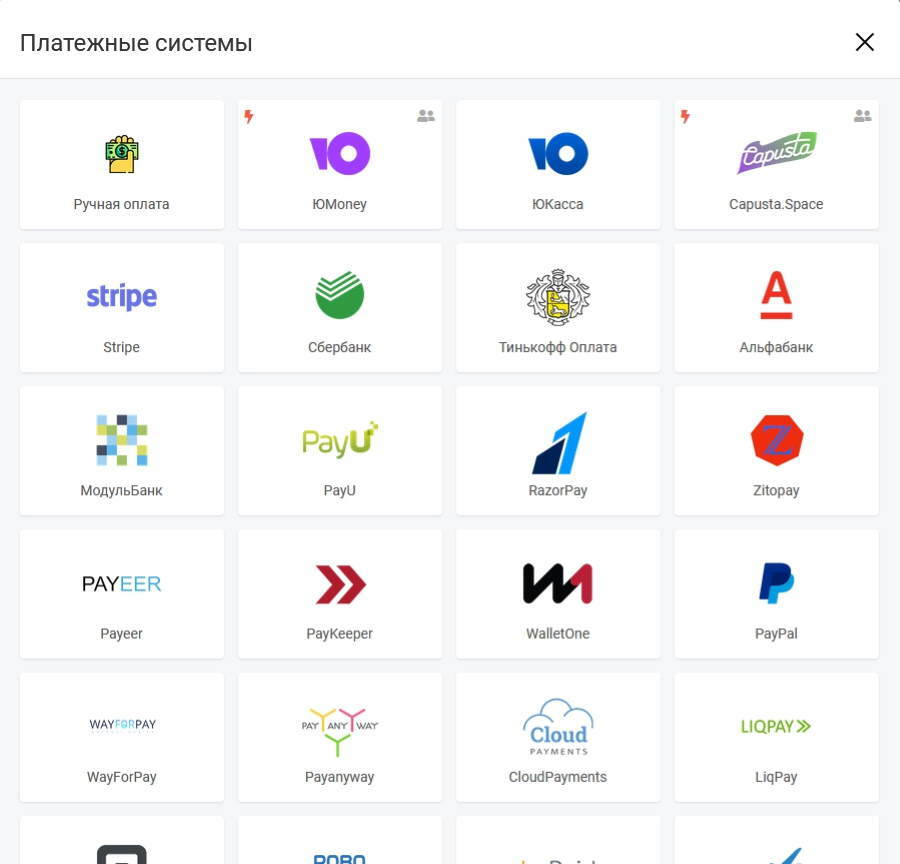 Список платежных систем для подключения оплаты доступен на вкладке Настройки -> Прием платежей