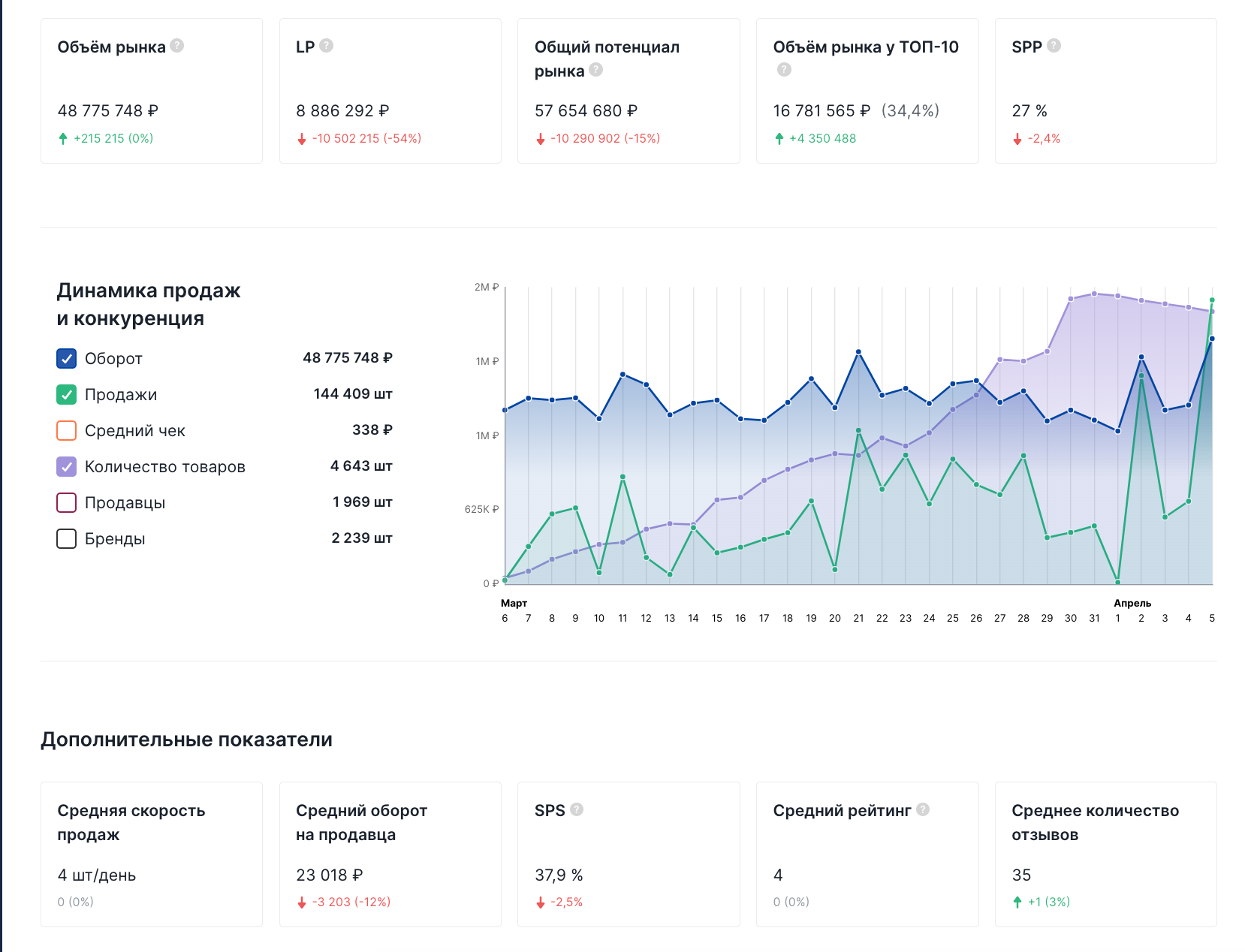 - SPP (процент товаров с продажами): 27%. Это значит, что продается практически каждый третий товар.