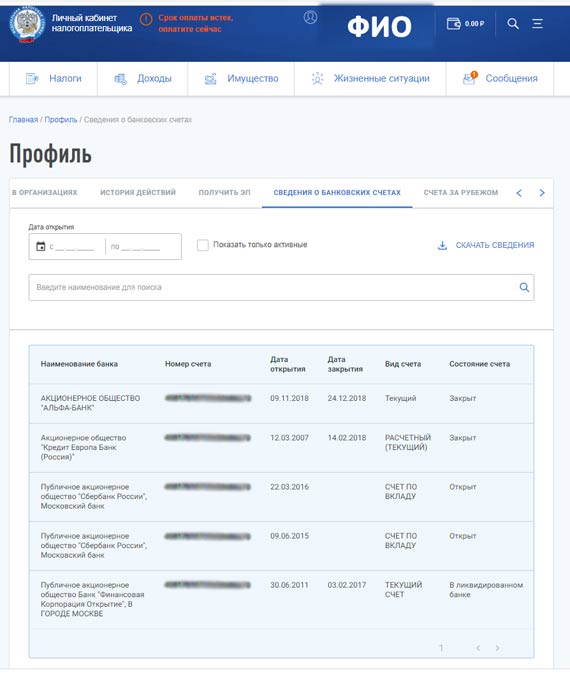 ВАЖНО! Если банковский счет был открыт до 1 июля 2014 года, сведений о нем в личном кабинете ФНС не будет. До этого числа банки не сообщали в ФНС о счетах, открытых физическими лицами.