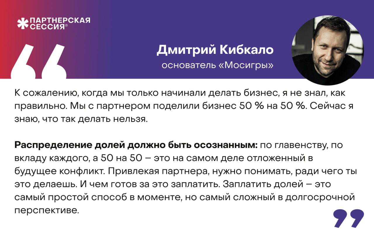 И если у вас 50 на 50, но у вас очень четко разграничены зоны принятия решений и зоны ответственности, и у вас нет ситуации дедлока, когда вы в тупике, а вы принимаете решение, идете и развиваете компанию, потому что вы определили главного в каких-то вопросах, каждый — в разных, то все отлично.