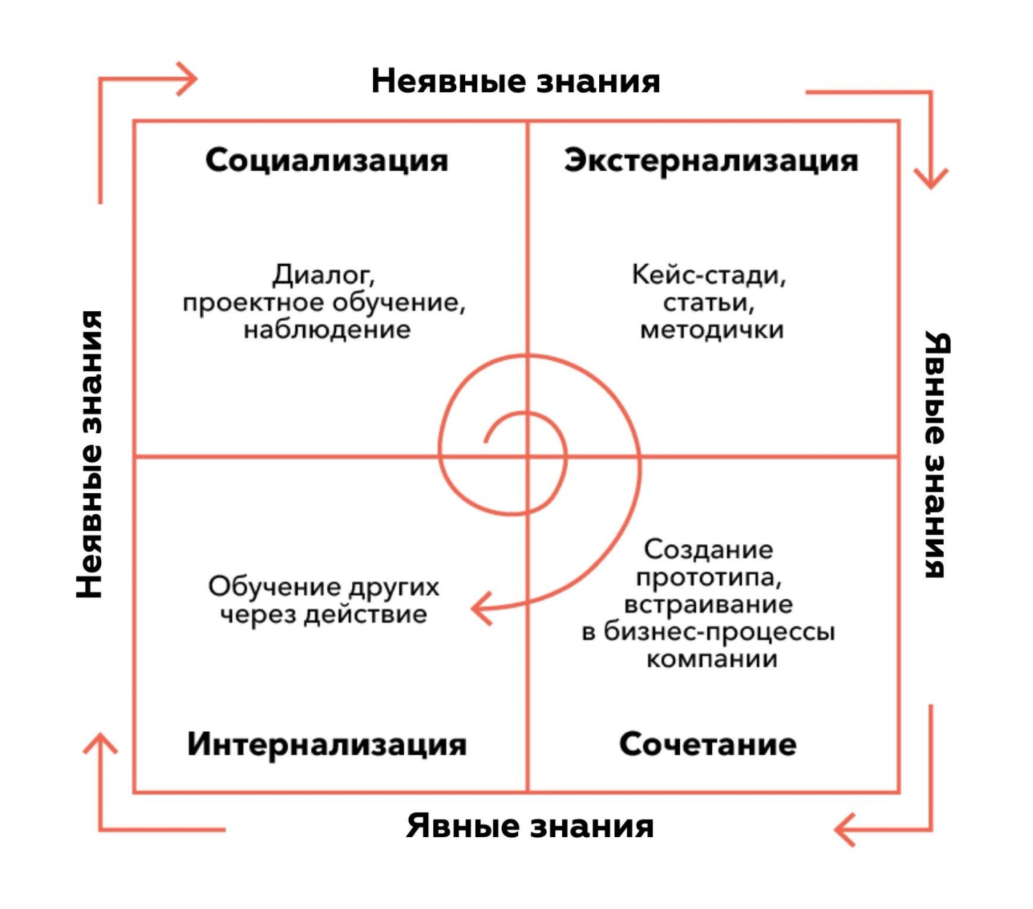 - Интернализация — через рефлексию и применение новых явных знаний сотрудники корректируют старые и формируют новые подходы в работе. К примеру, это происходит, когда сотрудники проходят тренинги или посещают вебинары. Это новое усвоенное знание циркулирует по спирали знания, инициируя дальнейшие процессы преобразования.