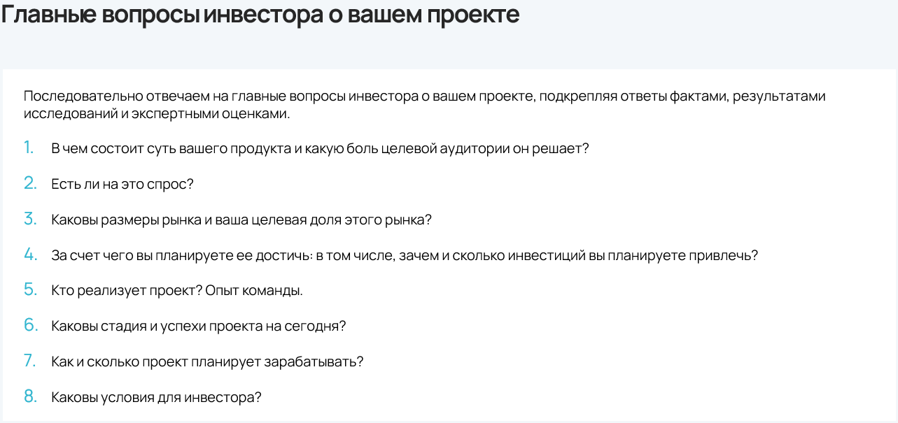 На этом этапе многие фаундеры часто спотыкаются на одной ошибке — они начинают слишком сильно “проваливаться” в описание своего продукта, приводя многостраничные документы с техническими нюансами и другими специфическими деталями. Но инвестора в первую очередь интересует, как он сможет заработать на бизнесе, построенном на вашем продукте. В этой ситуации чтобы успешно «продать» бизнес-процесс, нужно последовательно ответить на восемь главных вопросов инвестора бизнесу. Особенно про рынок, так как инвесторы предпочитают большие и/или активно растущие рынки. Например, инноваторы любят говорить: «у меня уникальный продукт, у которого нет аналогов и конкурентов», думая, что это привлечет инвестора. Но здесь с точностью до наоборот, потому что новые рынки создавать очень сложно и дорого. (Кстати, в случае инноваций стоит обращаться за государственной поддержкой)