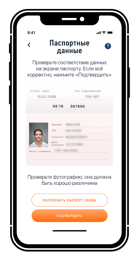 Схема удобна для тех, у кого нет доступа к личному кабинету. Достаточно отсканировать паспорт через приложение (документ помещается в обозначенный контур, затем нажимается кнопка «Распознать»). Также нужна фотография — ее можно сделать на камеру смартфона.