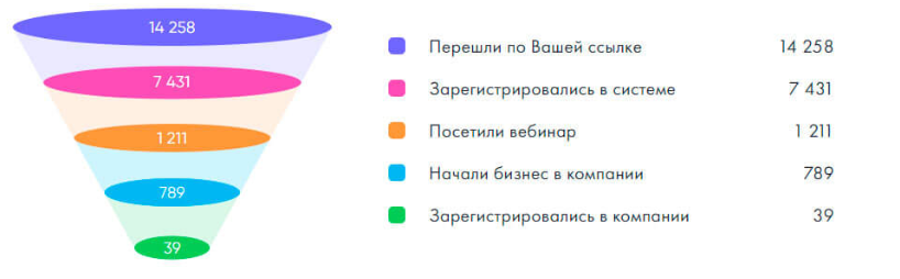 Благодаря статистическим данным, которые фиксируются на каждом этапе, вы в любой момент сможете отслеживать, сколько людей зарегистрировалось на лендинге, просмотрели вебинар, прошли курс обучения и зарегистрировались на сайте основной МЛМ-компании.