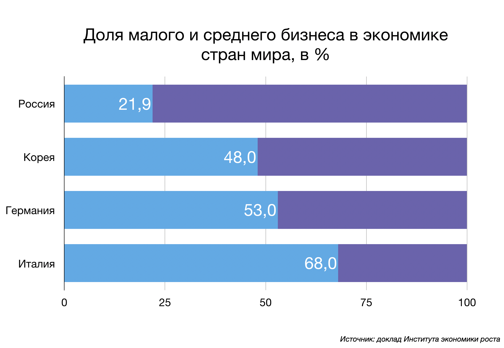 Доля малого и среднего предпринимательства в экономике России — 21,9%. Владимир Путин в своем послании Федеральному Собранию в 2018 году призывал довести этот показатель до 40% к 2025 году.