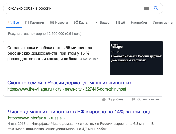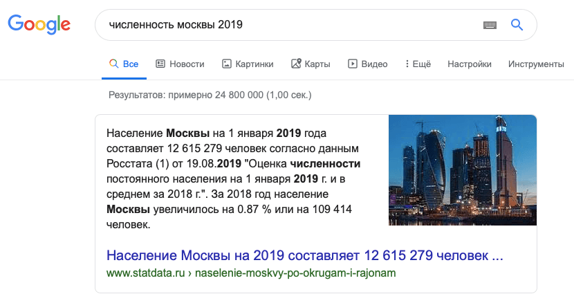 Например, если мы введем в поисковик «население Москвы 2019», то получим информацию о 12 615 279 человек.