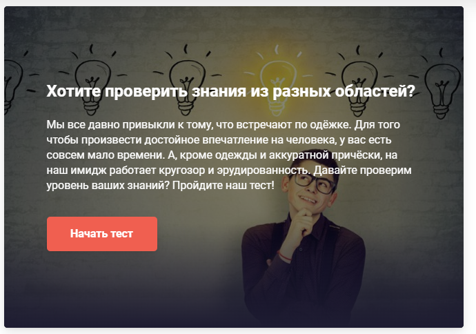 Пользователь не будет проходить тест ради теста. Ему важна смысловая нагрузка: «Что это за квиз?» Поэтому еще до прохождения опроса необходимо дать ответ на вопрос: «Что я получу/узнаю, если пройду его?» Что в данном случае может заинтересовать человека? Вот три основных варианта: