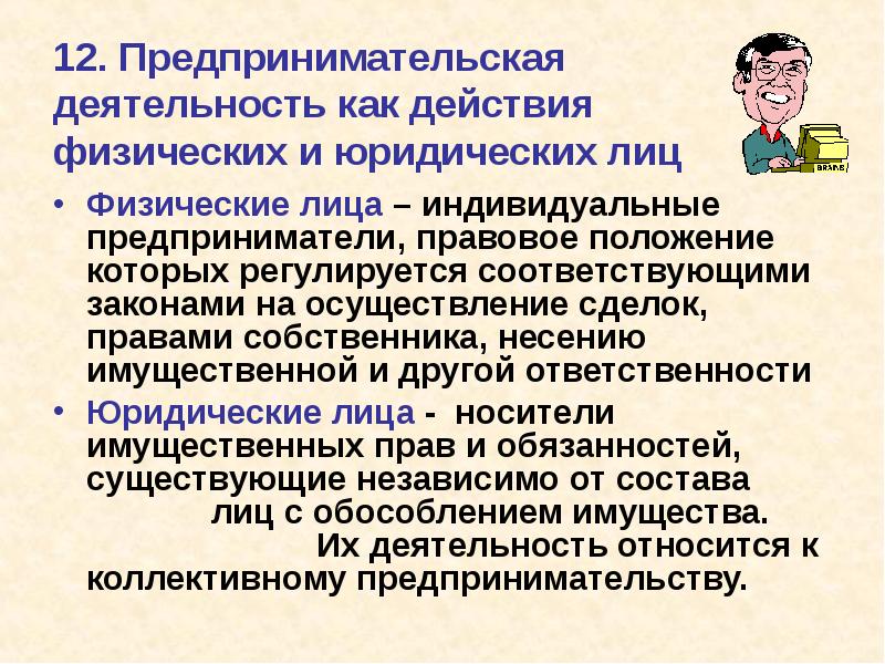 12. Предпринимательская деятельность как действия физических и юридических лиц Физические лица – индивидуальные предприниматели, правовое положение которых регулируется соответствующими законами на осуществление сделок, правами собственника, несению имущественной и другой ответственности Юридические лица — носители имущественных прав и обязанностей, существующие независимо от состава лиц с обособлением имущества. Их деятельность относится к коллективному предпринимательству.