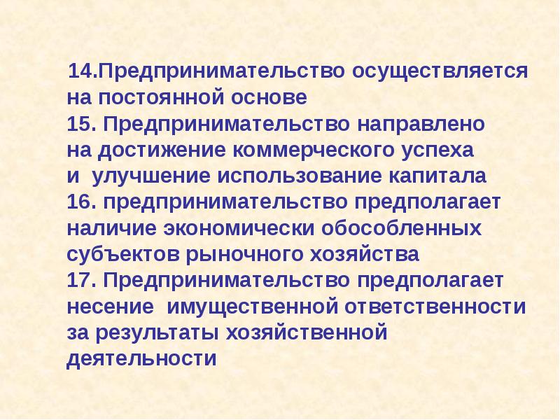 14.Предпринимательство осуществляется на постоянной основе 15. Предпринимательство направлено на достижение коммерческого успеха и улучшение использование капитала 16. предпринимательство предполагает наличие экономически обособленных субъектов рыночного хозяйства 17. Предпринимательство предполагает несение имущественной ответственности за результаты хозяйственной деятельности