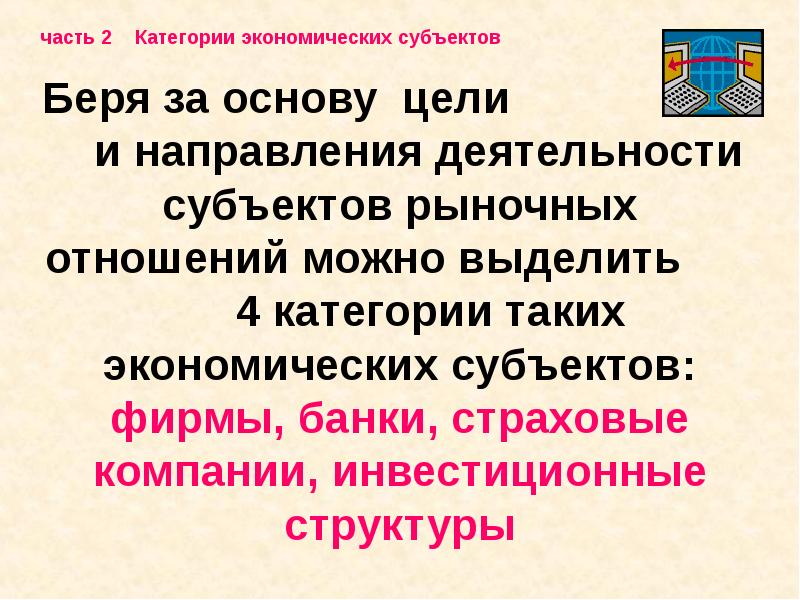 Беря за основу цели и направления деятельности субъектов рыночных отношений можно выделить 4 категории таких экономических субъектов: фирмы, банки, страховые компании, инвестиционные структуры
