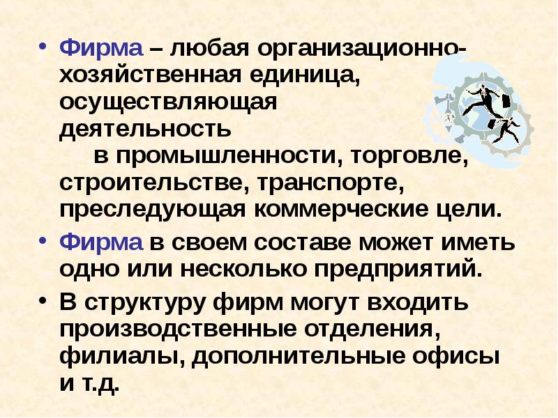 Фирма – любая организационно-хозяйственная единица, осуществляющая деятельность в промышленности, торговле, строительстве, транспорте, преследующая коммерческие цели. Фирма в своем составе может иметь одно или несколько предприятий. В структуру фирм могут входить производственные отделения, филиалы, дополнительные офисы и т.д.