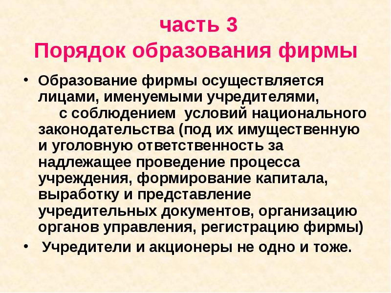 часть 3 Порядок образования фирмы Образование фирмы осуществляется лицами, именуемыми учредителями, с соблюдением условий национального законодательства (под их имущественную и уголовную ответственность за надлежащее проведение процесса учреждения, формирование капитала, выработку и представление учредительных документов, организацию органов управления, регистрацию фирмы) Учредители и акционеры не одно и тоже.