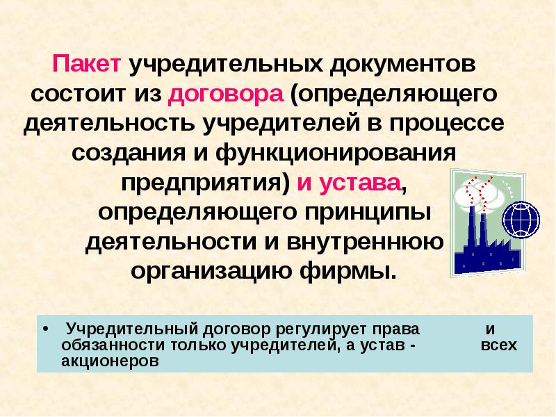 Пакет учредительных документов состоит из договора (определяющего деятельность учредителей в процессе создания и функционирования предприятия) и устава, определяющего принципы деятельности и внутреннюю организацию фирмы. Учредительный договор регулирует права и обязанности только учредителей, а устав — всех акционеров