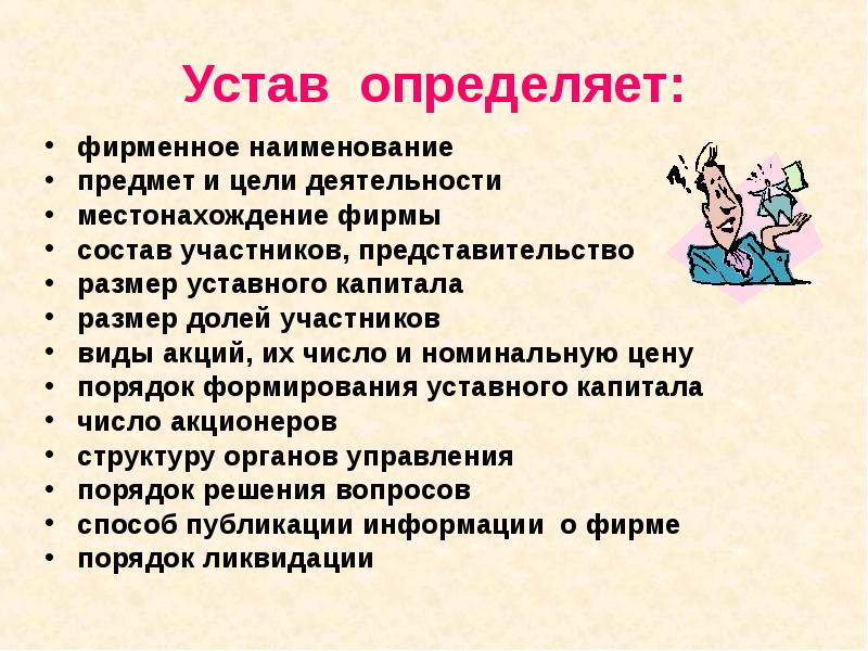 Устав определяет: фирменное наименование предмет и цели деятельности местонахождение фирмы состав участников, представительство размер уставного капитала размер долей участников виды акций, их число и номинальную цену порядок формирования уставного капитала число акционеров структуру органов управления порядок решения вопросов способ публикации информации о фирме порядок ликвидации