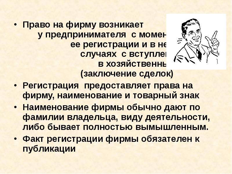 Право на фирму возникает у предпринимателя с момента ее регистрации и в некоторых случаях с вступления ее в хозяйственный оборот (заключение сделок) Регистрация предоставляет права на фирму, наименование и товарный знак Наименование фирмы обычно дают по фамилии владельца, виду деятельности, либо бывает полностью вымышленным. Факт регистрации фирмы обязателен к публикации