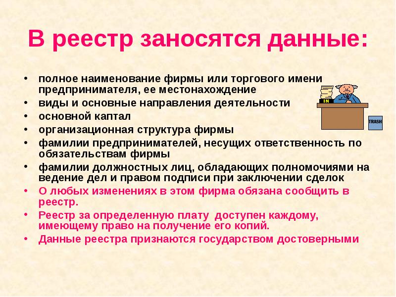 В реестр заносятся данные: полное наименование фирмы или торгового имени предпринимателя, ее местонахождение виды и основные направления деятельности основной каптал организационная структура фирмы фамилии предпринимателей, несущих ответственность по обязательствам фирмы фамилии должностных лиц, обладающих полномочиями на ведение дел и правом подписи при заключении сделок О любых изменениях в этом фирма обязана сообщить в реестр. Реестр за определенную плату доступен каждому, имеющему право на получение его копий. Данные реестра признаются государством достоверными