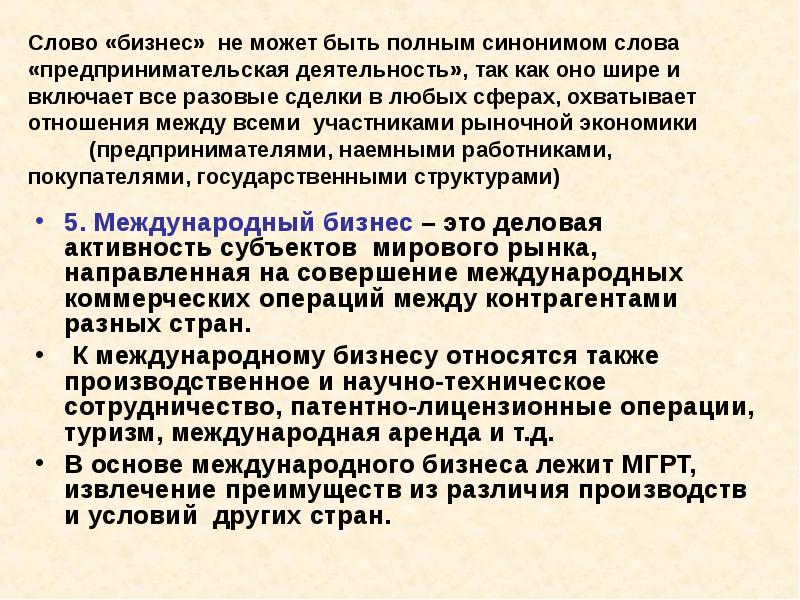 Слово «бизнес» не может быть полным синонимом слова «предпринимательская деятельность», так как оно шире и включает все разовые сделки в любых сферах, охватывает отношения между всеми участниками рыночной экономики (предпринимателями, наемными работниками, покупателями, государственными структурами) 5. Международный бизнес – это деловая активность субъектов мирового рынка, направленная на совершение международных коммерческих операций между контрагентами разных стран. К международному бизнесу относятся также производственное и научно-техническое сотрудничество, патентно-лицензионные операции, туризм, международная аренда и т.д. В основе международного бизнеса лежит МГРТ, извлечение преимуществ из различия производств и условий других стран.