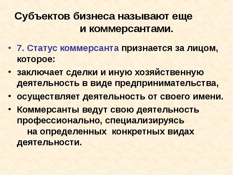 Субъектов бизнеса называют еще и коммерсантами. 7. Статус коммерсанта признается за лицом, которое: заключает сделки и иную хозяйственную деятельность в виде предпринимательства, осуществляет деятельность от своего имени. Коммерсанты ведут свою деятельность профессионально, специализируясь на определенных конкретных видах деятельности.