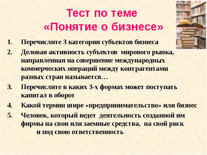 Тест по теме «Понятие о бизнесе» Перечислите 3 категории субъектов бизнеса Деловая активность субъектов мирового рынка, направленная на совершение международных коммерческих операций между контрагентами разных стран называется… Перечислите в каких 3-х формах может поступать капитал в оборот Какой термин шире «предпринимательство» или бизнес Человек, который ведет деятельность созданной им фирмы на свои или заемные средства, на свой риск и под свою ответственность
