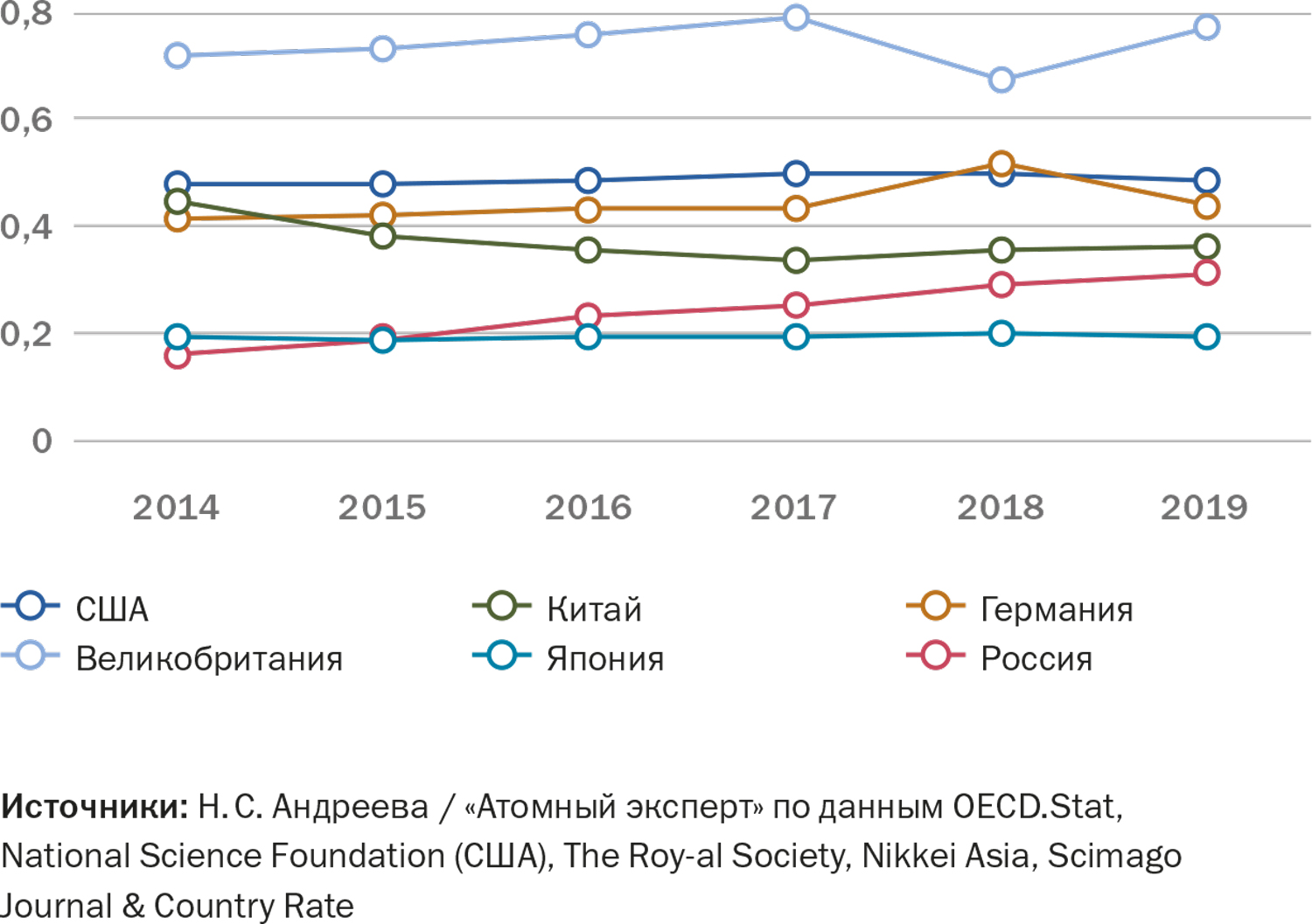 Например, несмотря на растущую публикационную активность российских исследователей, на фоне остальных стран — мировых научных лидеров очень заметна проблема качества и глобальной востребованности российских научных результатов: уровень интереса к российским научным публикациям (цитируемость) стабильно в полтора-два раза ниже, чем к результатам и публикациям зарубежных коллег.