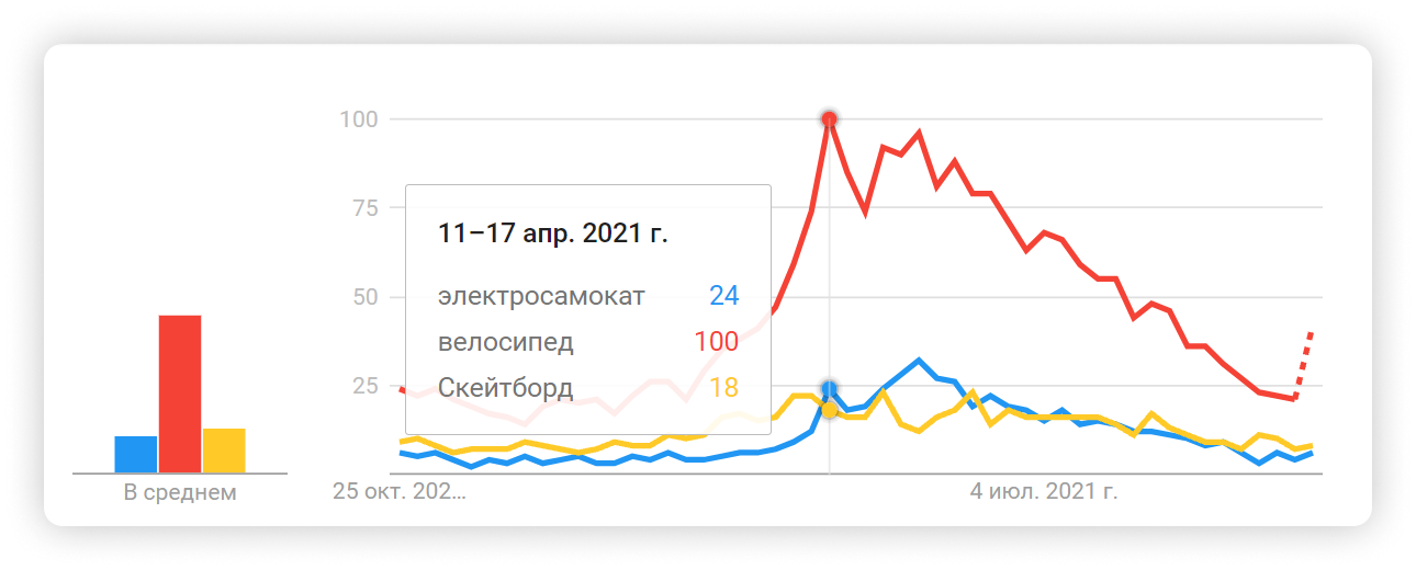 По графику лидирует запрос «велосипед». Наивысший пик популярности в 100 баллов приходится на апрель 2021 г.