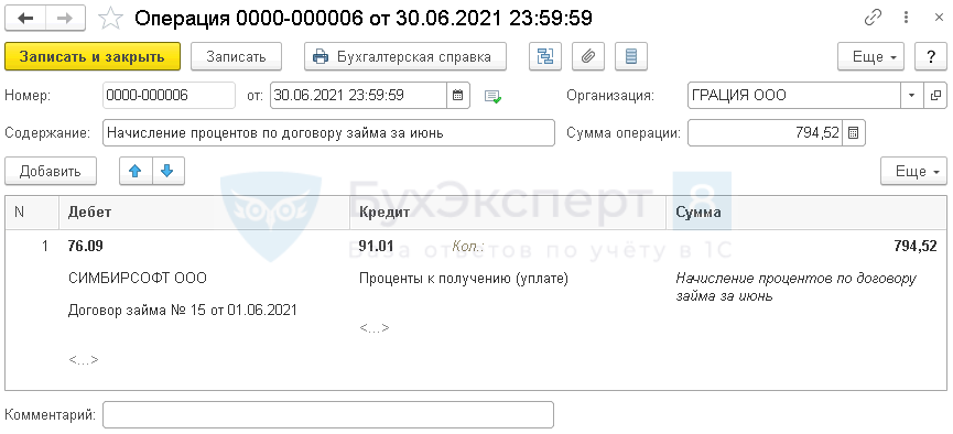 Отразите начисление процентов документом Операция, введенная вручную в разделе Операции — Операции, введенные вручную — кнопка Создать — Операция.