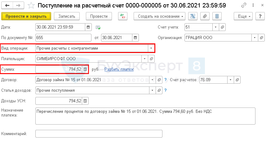 Поступление на счет процентов отразите документом Поступление на расчетный счет вид операции Прочие расчеты с контрагентами в разделе Банк и касса — Банковские выписки – кнопка Поступление.