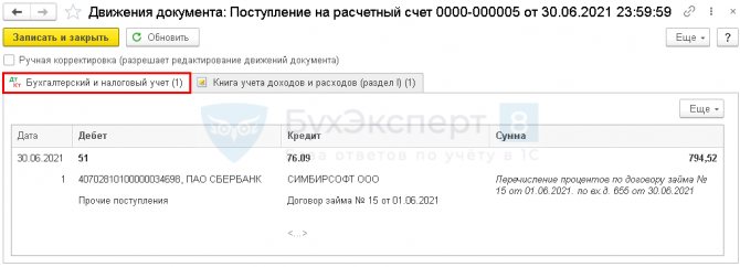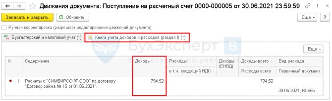 Документ Поступление на расчетный счет формирует движения по регистру Книга учета доходов и расходов (раздел I):
