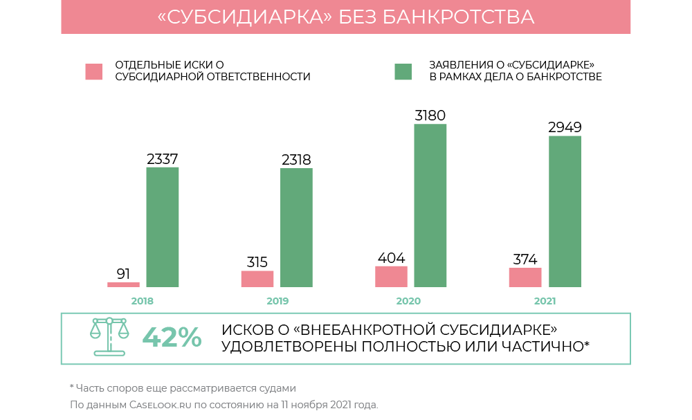 Изначально самой большой проблемой «внебанкротной субсидиарки» была невозможность для кредитора инициировать данную процедуру в том случае, если основания привлечения к субсидиарной ответственности были известны ему еще в ходе рассмотрения дела о банкротстве, отмечает Тарнопольская. Но летом 2021-го Верховный суд в своем определении по делу «Логостайла», похоже, снял этот «барьер» (подробнее — ВС одобрил «субсидиарку» без банкротства). «Теперь отдельный иск о привлечении КДЛ к субсидиарной ответственности кредитор сможет подать, даже если основания ответственности были и раньше «ясны как день», — уверена эксперт.