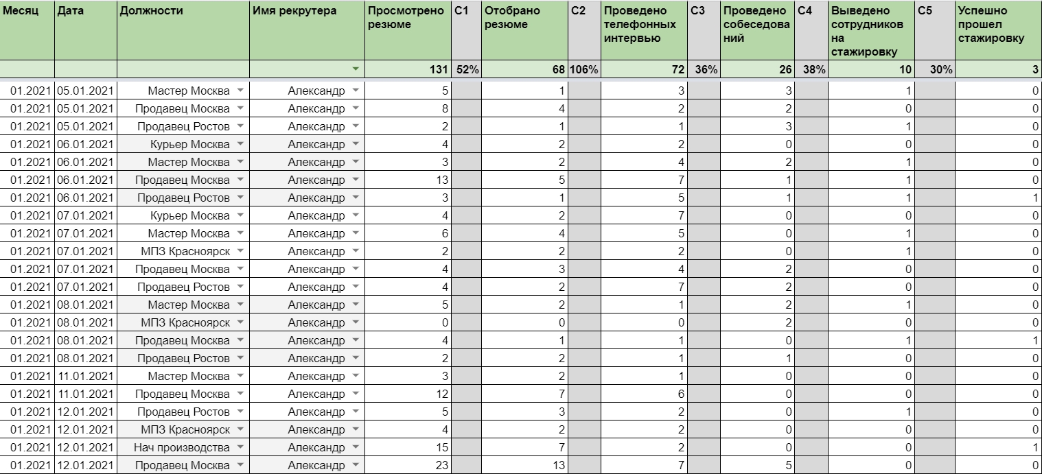Просмотрено резюме -> Отобрано резюме -> Проведено телефонных интервью -> Проведено собеседований -> Выведено на стажировку -> Успешно прошел стажировку -> Вышел на работу