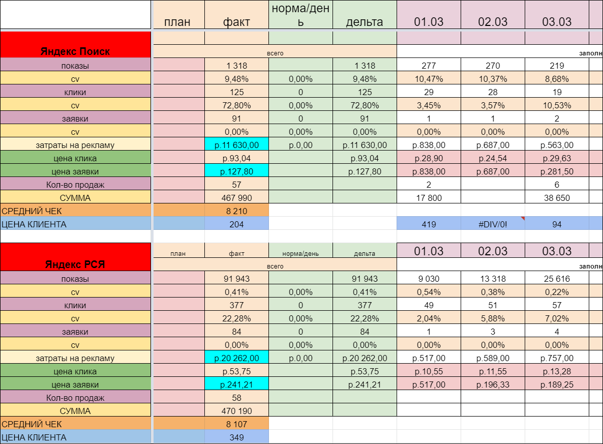 Ежедневно и по каждой неделе знаем по каждому каналу: цена заявки, цена клиента и средний чек в канале.