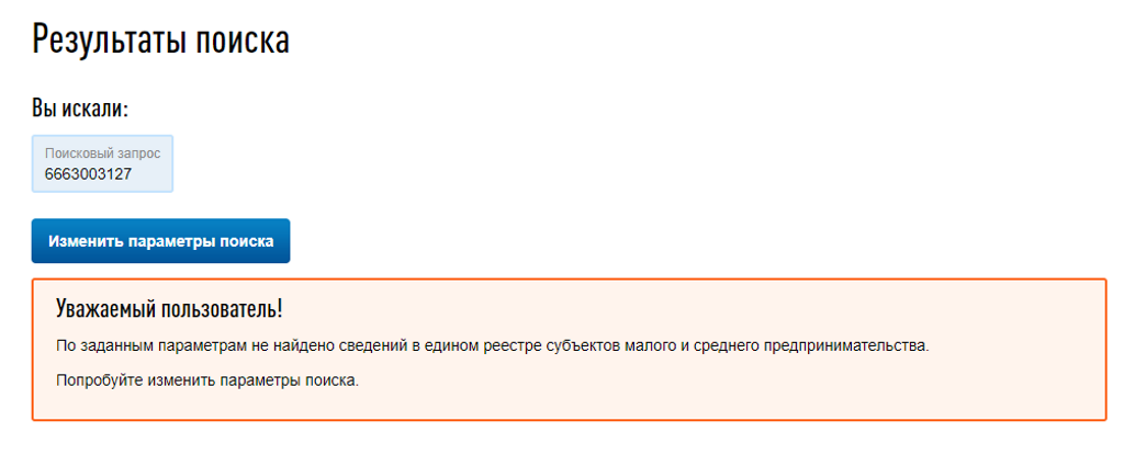 Если вы входите в реестр, сервис покажет, с какой даты вы являетесь субъектом МСП и к какой категории относитесь: микро-, малое или среднее предприятие. Если ФНС исключила бизнес из реестра, сервис об этом тоже сообщит.